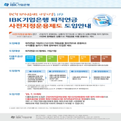 근로자가 퇴직연금을 합리적으로 운용하고 수익률을 높일 수 있도록 고용노동부에서 2022년 7월 12일 사전지정운용제도, 즉 디폴트옵션이 도입되었는데, 1년의 유예기간을 거쳐 7월 12일부터 법적