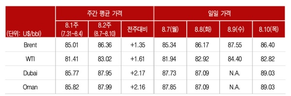 8월 현재 평균 유가는 아래와 같으며 유가상승 원인은 다음과 같습니다.