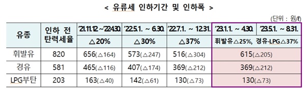 정부는 이달 말 종료되는 유류세 인하 조치를 10월 말까지 2개월 연장했습니다. 휘발유는 올해 1월부터 25%, 경유· LPG는 지난해 7월부터 37%의 인하율을 유지하고 있습니다.