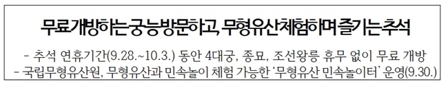 이번 연휴 기간에 4대 궁과 종묘, 조선 왕릉을 휴무일 없이 무료개방합니다. 또한 무형유산과 민속놀이 체험 프로그램을 운영합니다.