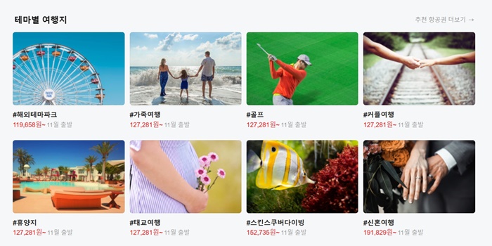 여행 테마를 선택하시면 출발 월, 지역을 선택하시면 오른쪽에 여행지 추천 목록을 볼 수 있어 편리합니다.