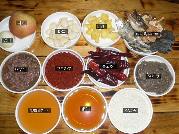 간 마늘 2컵, 간 생강 2큰술, 고춧가루 7~8컵, 멸치 액젓 3컵, 멸치 진젓 반 컵, 소금 1/4컵, 매실액 반 컵, 찹쌀풀 3컵, 김장 육수 6컵, 새우젓 2컵 등