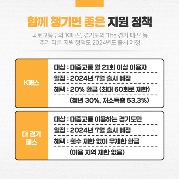국토교통부의 ‘K패스’, 경기도의 ‘The 경기 패스’도 있으니 본인에게 해당하는 정책을 적극적으로 활용해 보시기 바랍니다.